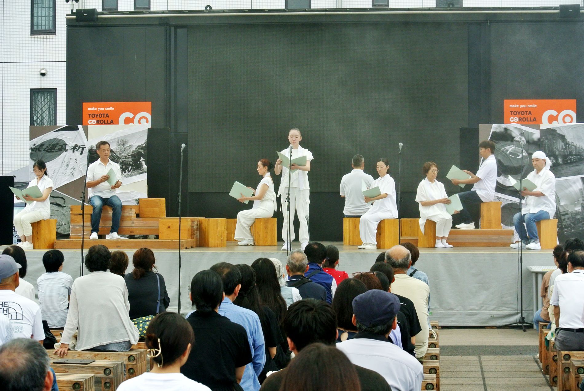 今年の会場は大分駅前のメインストリート沿いでした。劇中でも語られる場所のまさに目の前で公演だったため、場所の記憶を通して、地元・大分でも戦争で大きな爪痕が残ったこと、そこから復興し、今の私たちの日常につながっていることを観てくださった方により強く実感してもらえたのではないでしょうか。